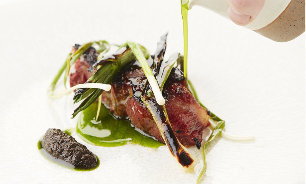 Mettre une cuillère de pâte d’ail des ours sur l’assiette et déposer un peu de collier d’agneau à côté. Couvrir avec les jeunes oignons et arroser encore d’un peu de vinaigrette.