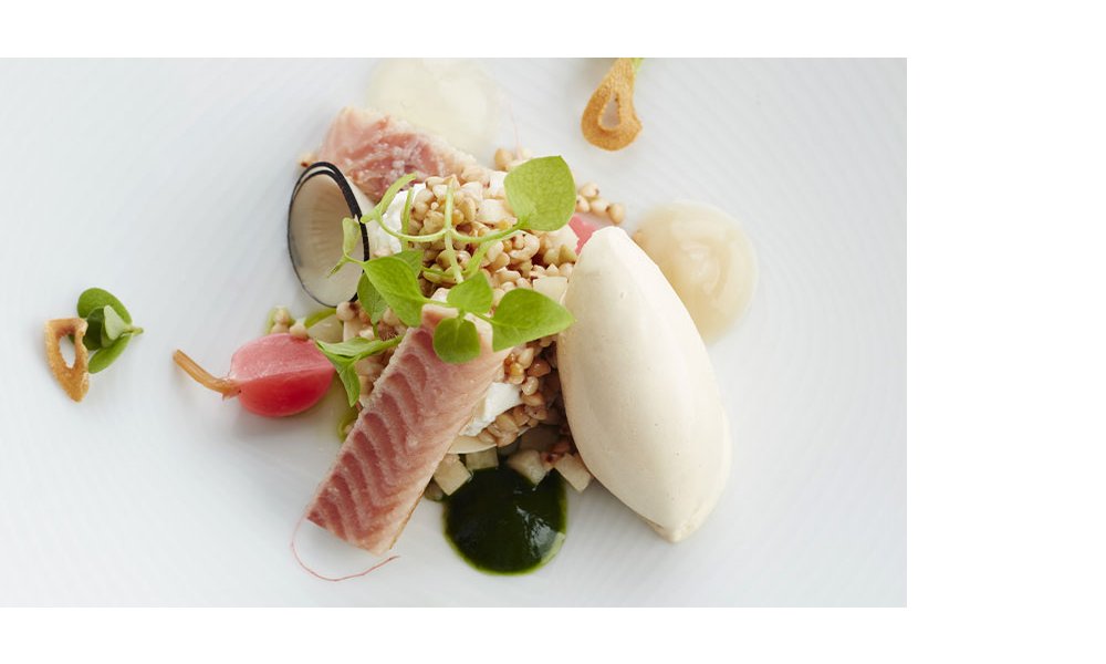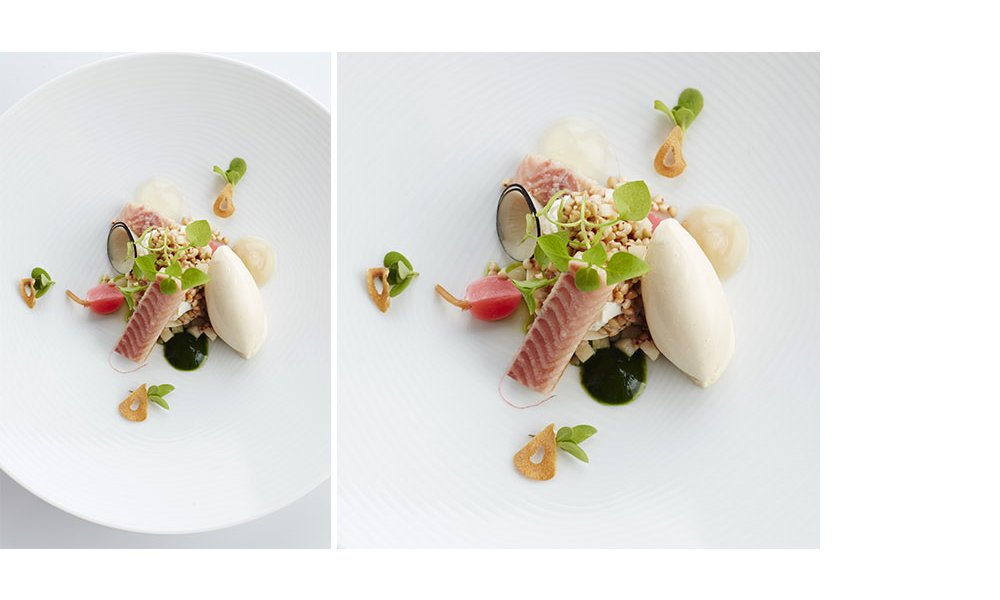 Cuire les chutes de navet dans le lait et la crème pour la panna cotta. 300 gr de navet pour 500gr de lait et 500 gr de crème. Après cuisson, assaisonner, mixer et ajouter 12 gr de gélatine, couler en cercle Flexipan de 12 cm de diamètre.