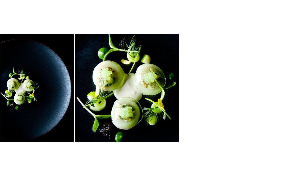 Tailler les Saint-Jacques en deux, disposer les tranches sur assiette. Assaisonner de poivre. Ouvrir les huîtres, les hacher au couteau. Assaisonner de poivre, de ciboulette ciselée et de aneth haché, finir avec un peu de zeste de citron vert. Disposer un peu de haché d’huîtres sur chaque Saint-Jacques.
