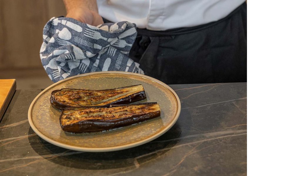 - Retirez la chair de l’aubergine à la cuillère et coupez-la finement au cutter. Faites blanchir 4 carottes et glacez-les au beurre et à la Kasteelbier. Parsemez de graines de sésame.