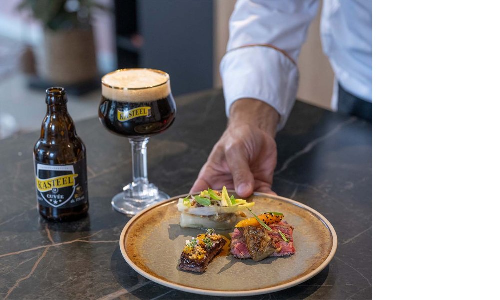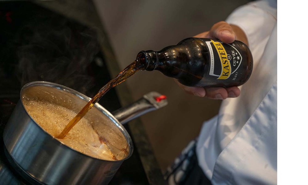 - Portez à ébullition la Kasteelbier et le fond de bœuf jusqu’à obtention d’un sirop. Ajoutez le sirop de Loon.