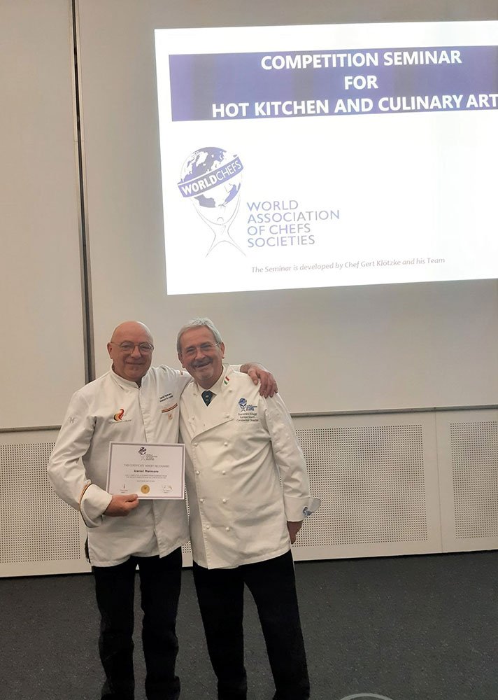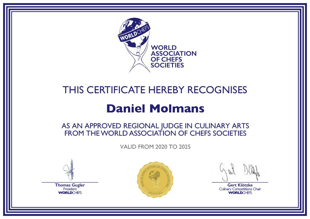 Le but de ce séminaire était de certifier en tant que « juge » les chefs représentant leur pays au sein de World Association of Chefs Societies. Toute une journée de formation à cette compétence pointue et exigeante suivie d’une épreuve écrite auront permis à Daniel Molmans d’acquérir le titre de « juge » régional.