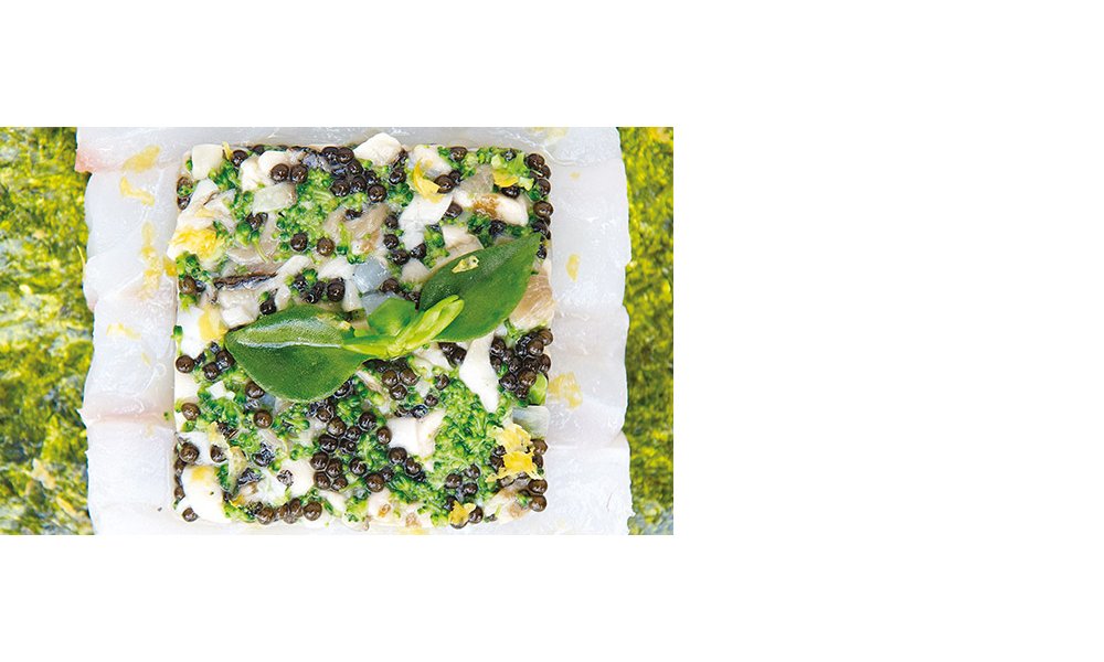 Dresser le bar juste cuit et le mélange huîtres, brocoli et caviar sur le dessus en un carré plus petit.