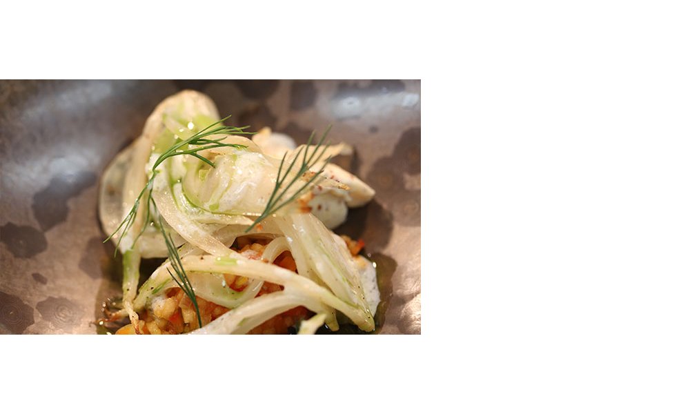Servir sur assiette, une quenelle de condiment, deux fenouils, l'huile, du petit lait et des peluches d'aneth.