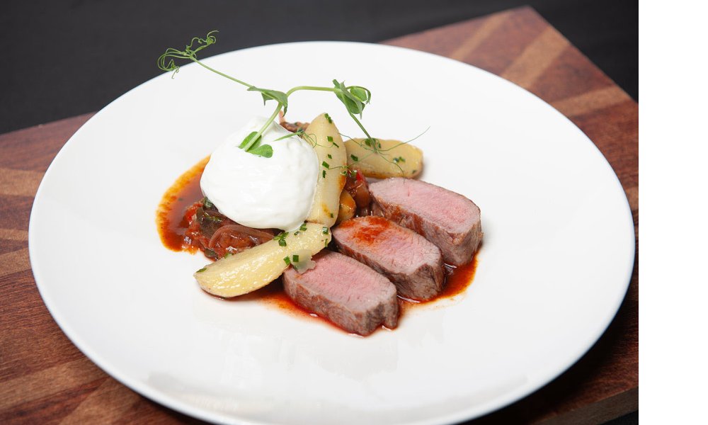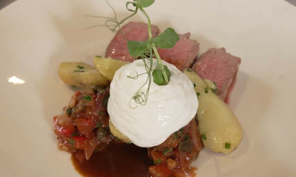 - Pour la viande d’agneau et le fond: faire cuire les filets d’agneau (cuisson rosée). Mettre la demi-glace à mijoter jusqu’à obtenir la consistance d’une sauce et mixer avec l’ail séché. Déposer le tout sur une assiette puis recouvrir de caponata et d’un peu de spuma di mozzarella.