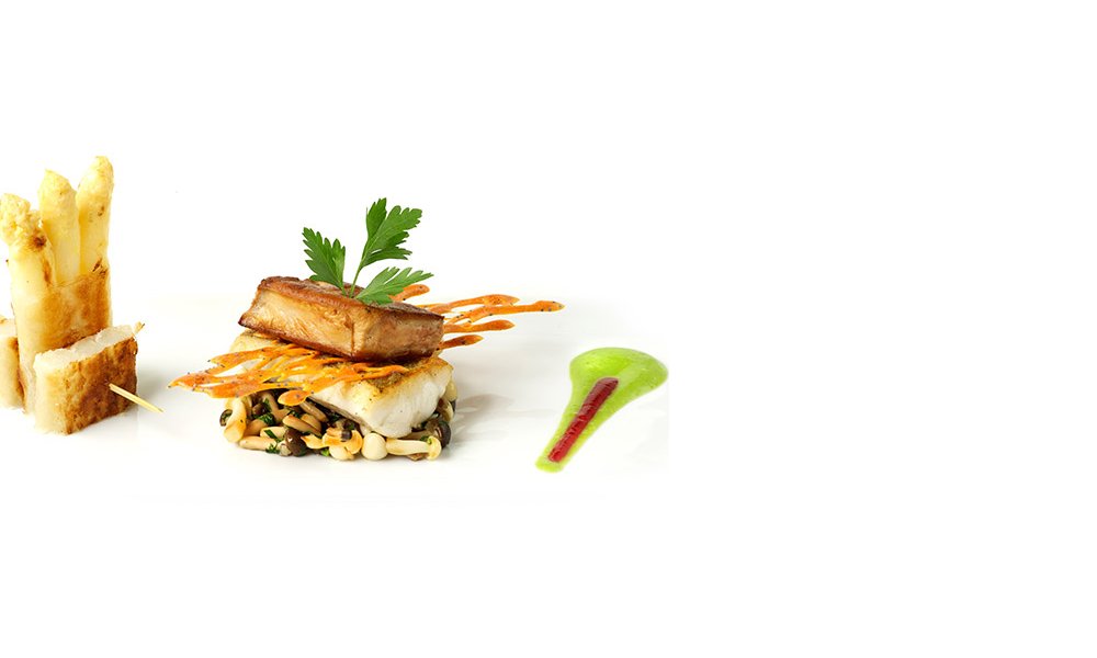 Déposer une portion de sandre sur un lit de minis champignons, ajouter un décor en pâte bien dorée, terminer par l'escalope de foie gras.