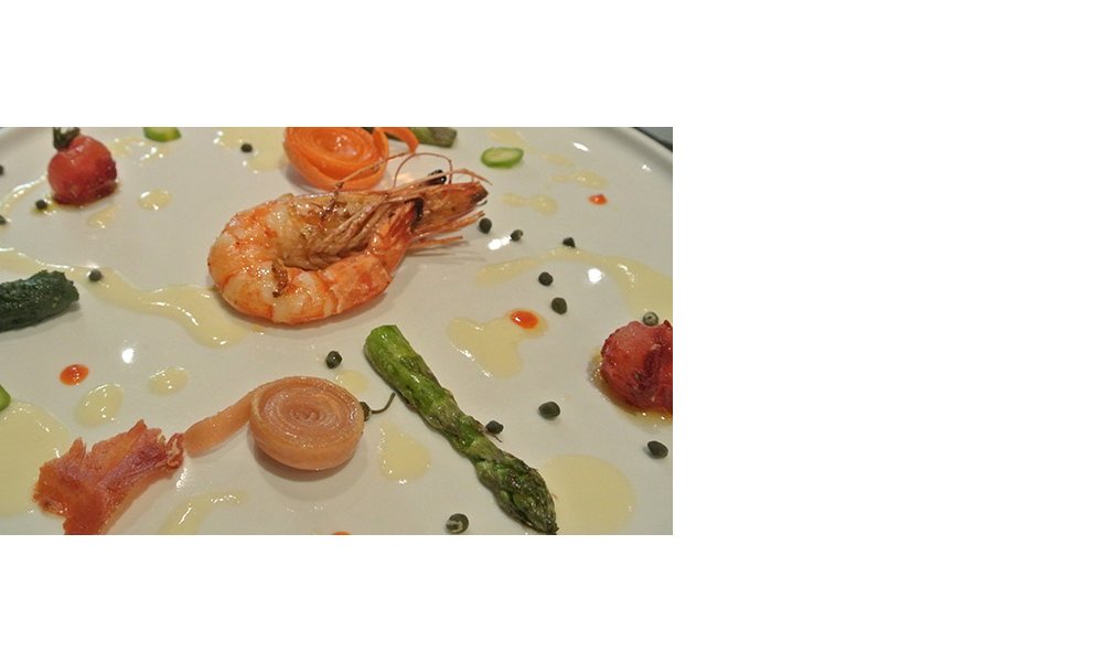 Cuire les gambas à la poêle et les déposer au centre de l’assiette, finir l’assiette avec les asperges, les pâtes et la crème de parmesan.