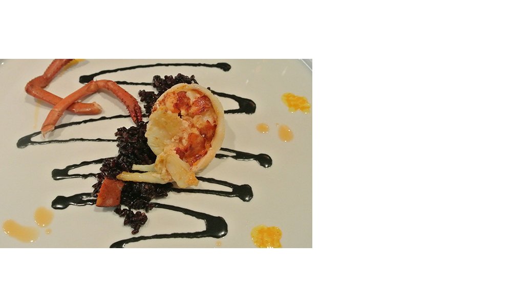 Dressage : poser le riz sur l’assiette et le homard par-dessus. Poser quelques traits d’encre de seiche et crème de safran.
