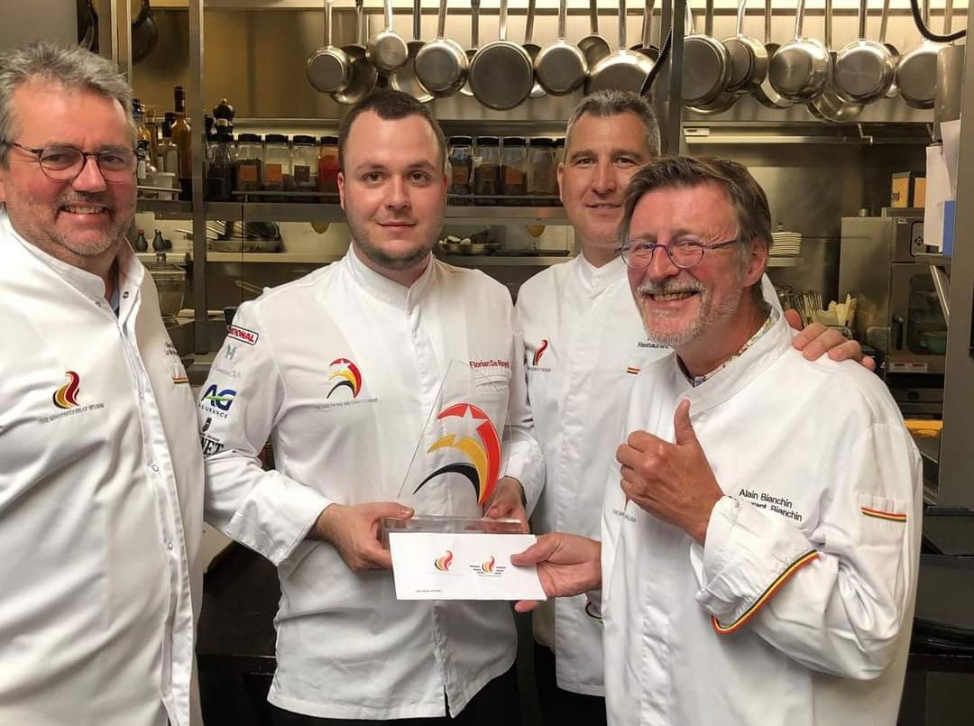 Visite amicale et des plus jubilatoires pour le lauréat du Concours de l’Etoile de la Cuisine Belge, c’est en juillet que Florian De Ruyck a reçu la visite des représentants du CA des Mastercooks, Olivier Wilbers et Claude Pohlig. Une visite qui avait pour but de remettre le Trophée dudit concours au jeune second d’Alain Bianchin. Une belle occasion pour les Mastercooks de pouvoir goûter les délicieuses préparations que Florian et Alain proposent au restaurant éponyme de ce dernier, le Restaurant Alain Bianchin à Overijse.