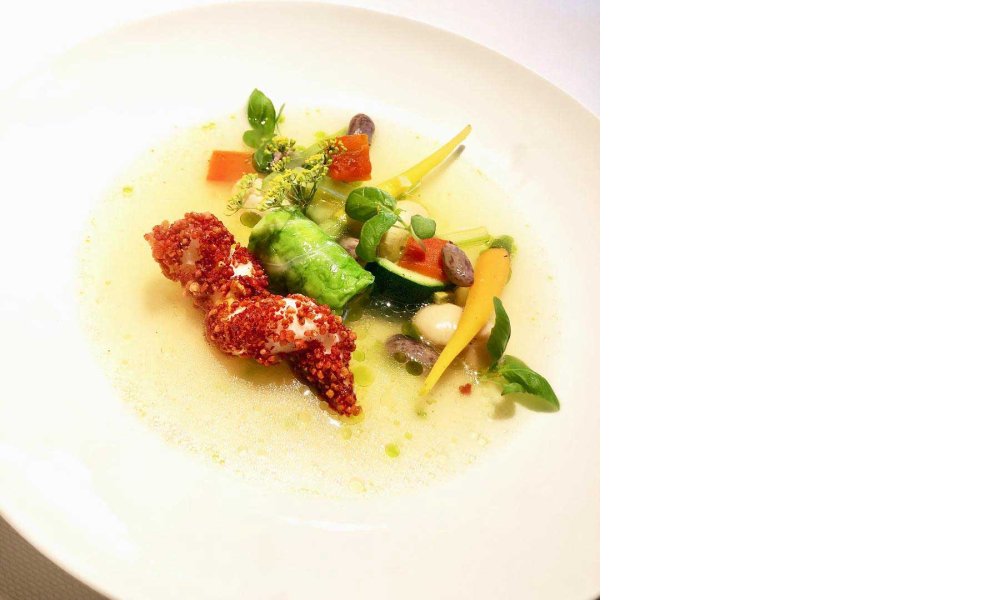 Mettre le bouillon dans le fond de l’assiette puis déposer harmonieusement les langoustines dessus.