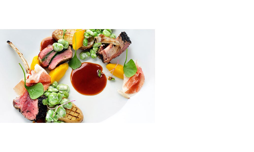 Disposer tous les éléments sur une assiette et terminer avec le jambon de Mangalica et le pourpier.