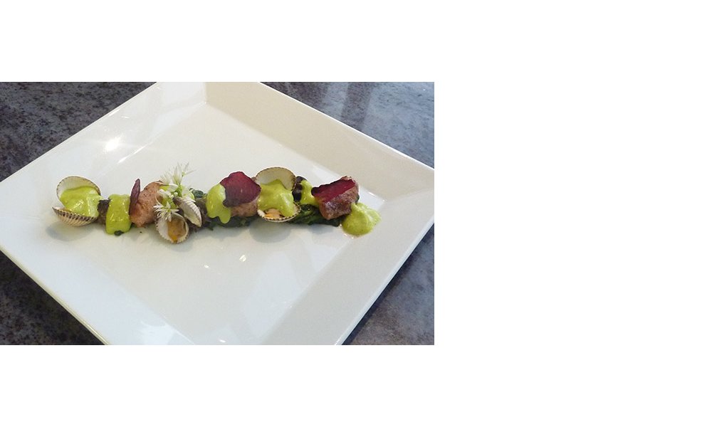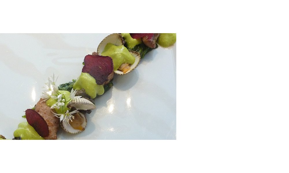 Dresser une ligne d’épinards en oblique sur l’assiette. Y poser en alternance les petits gris, les sots l’y laissent et les coques. Finaliser par quelques touches d’ail des ours passé au siphon et quelques chips de betterave.