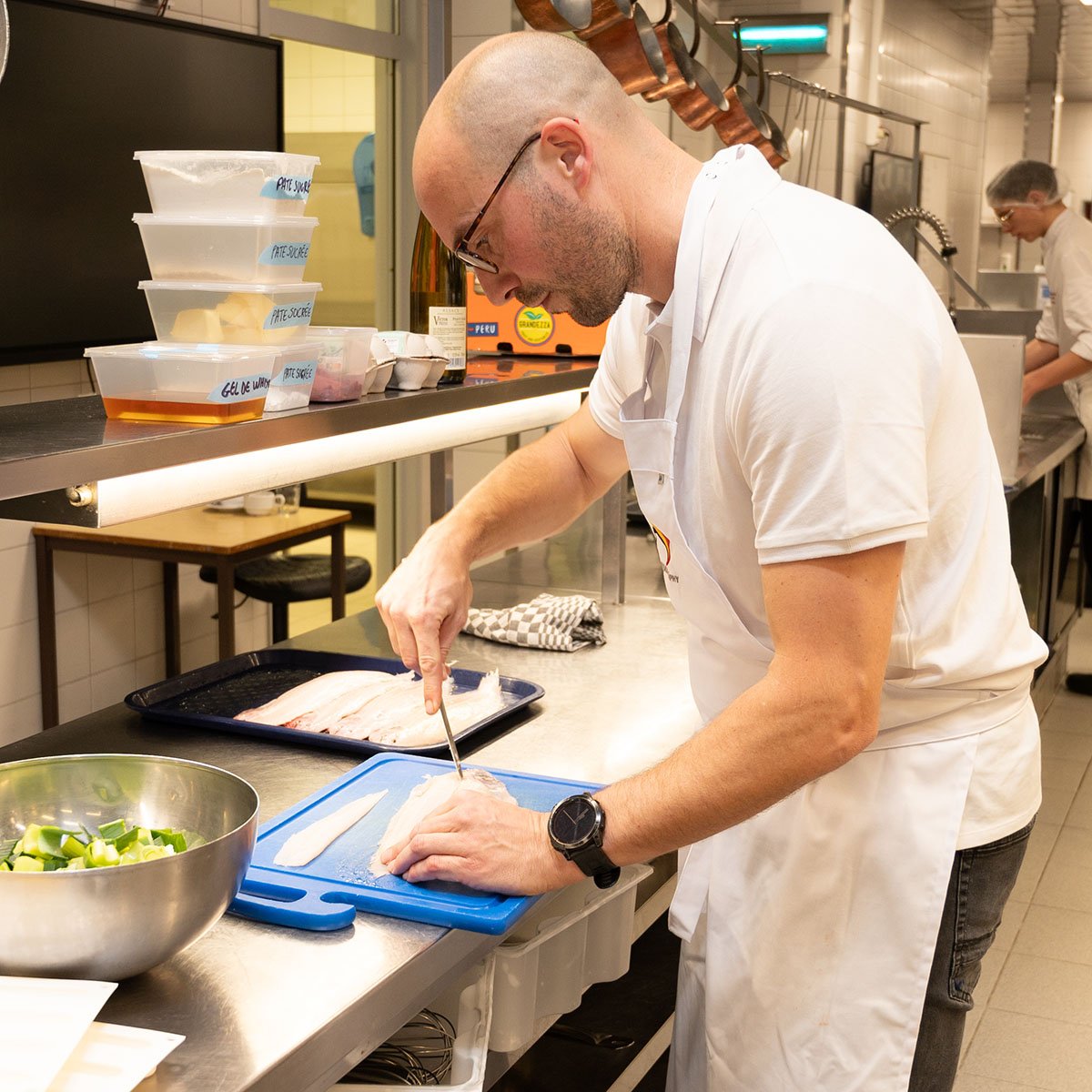 - Un plat principal à base de filet de sole, huîtres et asperges vertes, inspiré de la recette classique du “Grand-Papa Georges” (Comme Chez Soi), revisité avec une touche contemporaine personnelle.