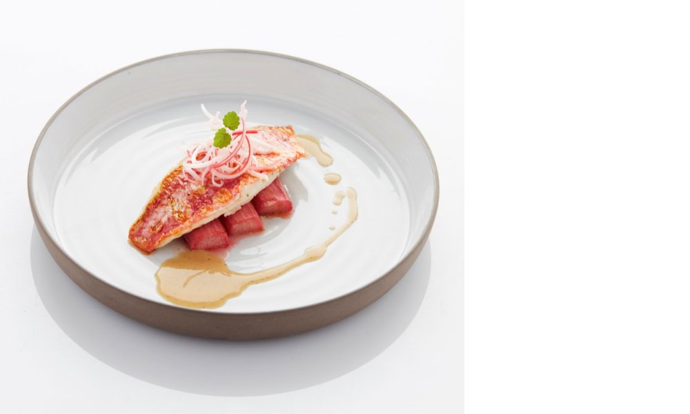Finition : Déposer trois tronçons de rhubarbe sur chaque assiette. Poser le poisson sur ceux-ci et entourer d’un peu de sauce. Terminer avec la julienne de rhubarbe et des jets au choix.