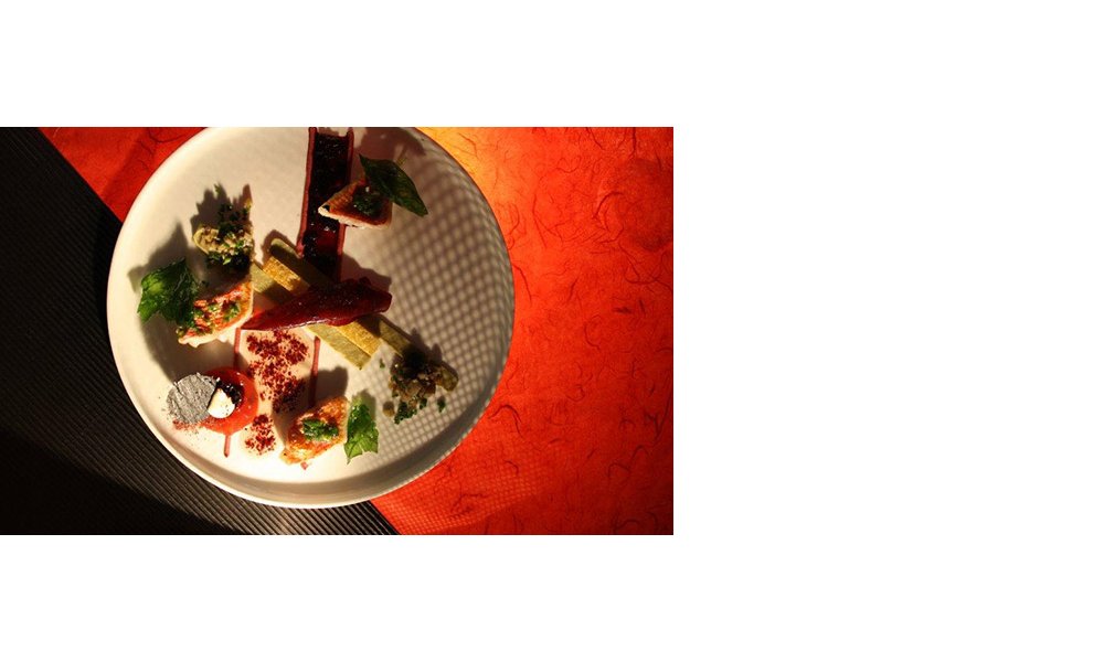 Pour le beurre de betterave, mettre 2 jaunes d’œufs et 100 g de purée de betterave à chauffer au Thermomix jusqu’à épaississement. Baisser la température et monter avec 30 g de beurre. Ajouter un trait de vinaigre de myrtilles et une pointe de couteau de sucre impalpable.