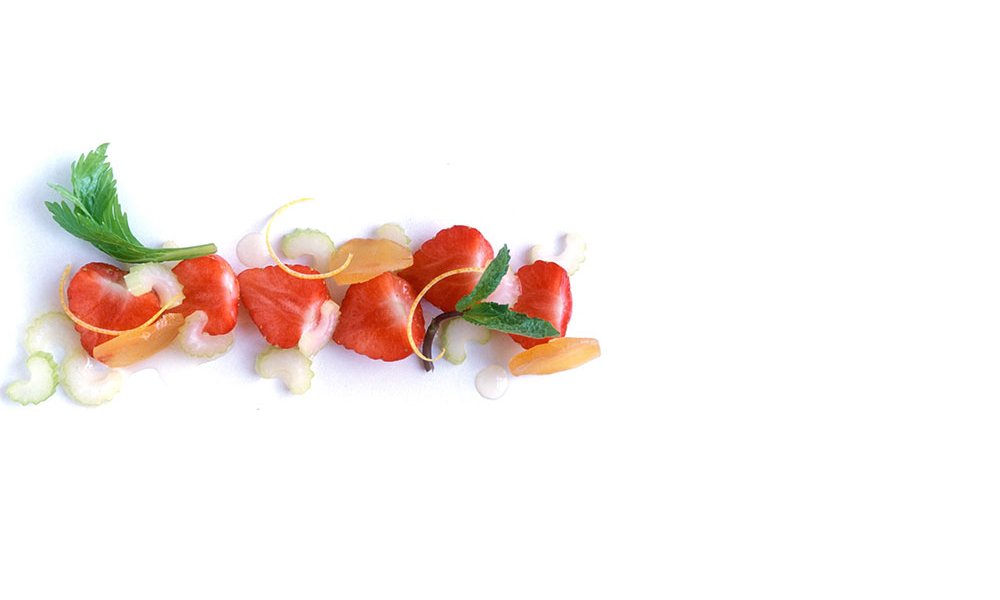 Mélanger les fraises et le céleri dans de petits verres ou de petits bols et assaisonner avec le miel, le sirop et le gingembre ainsi que les bâtonnets confits de zeste de citron.