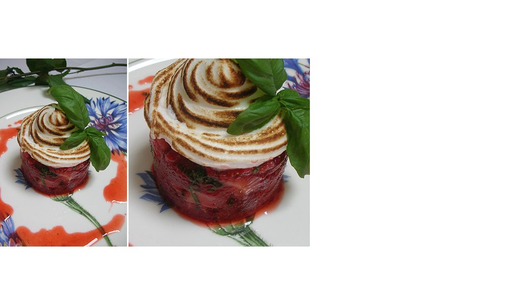 Couper les fraises en petits morceaux en enlevant le pédoncule. Ajouter le basilic finement ciselé et le poivre du moulin, bien mélanger. Mettre les fraises dans un emporte-pièce. Battre les blancs en neige avec un peu de sucre et les dresser à la poche au-dessus des fraises. Gratiner au chalumeau.