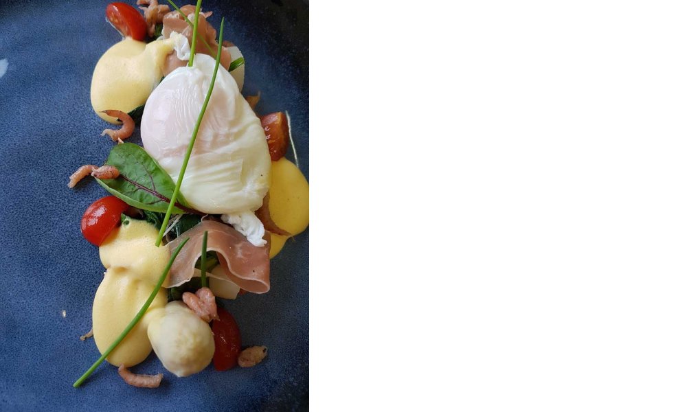 Verdeel over de borden: asperges, mousseline, spinazie, sneetjes ibericoham, gepocheerd ei, garnalen, kwartjes trostomaatjes, citroenolijfolie, peper en zout, bieslook.