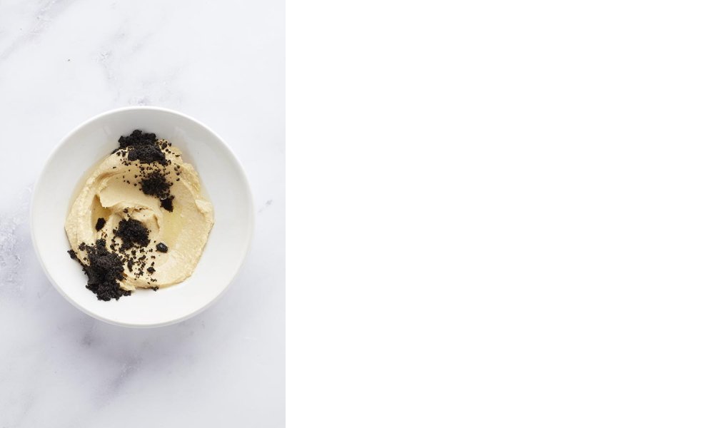 Veeg de hummus in het bord, besprenkel met lookolie en poeder van zwarte olijf of olijfolie