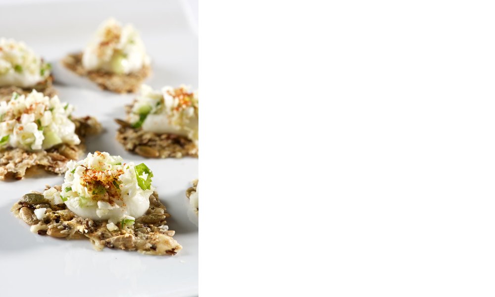 Leg op elk toastje een koffielepel bloemkoolpuree en hierop een koffielepel bloemkooltartaar. Werk af met gerookt paprikapoeder.