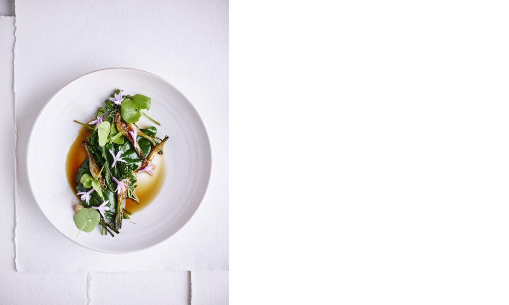 Schik de hamsa, brave hendrik en bosuitjes op een bord. Overgiet met de jus. Werk af met Kaapse lookbloem, posteleinbloem en Oost-Indische kers.