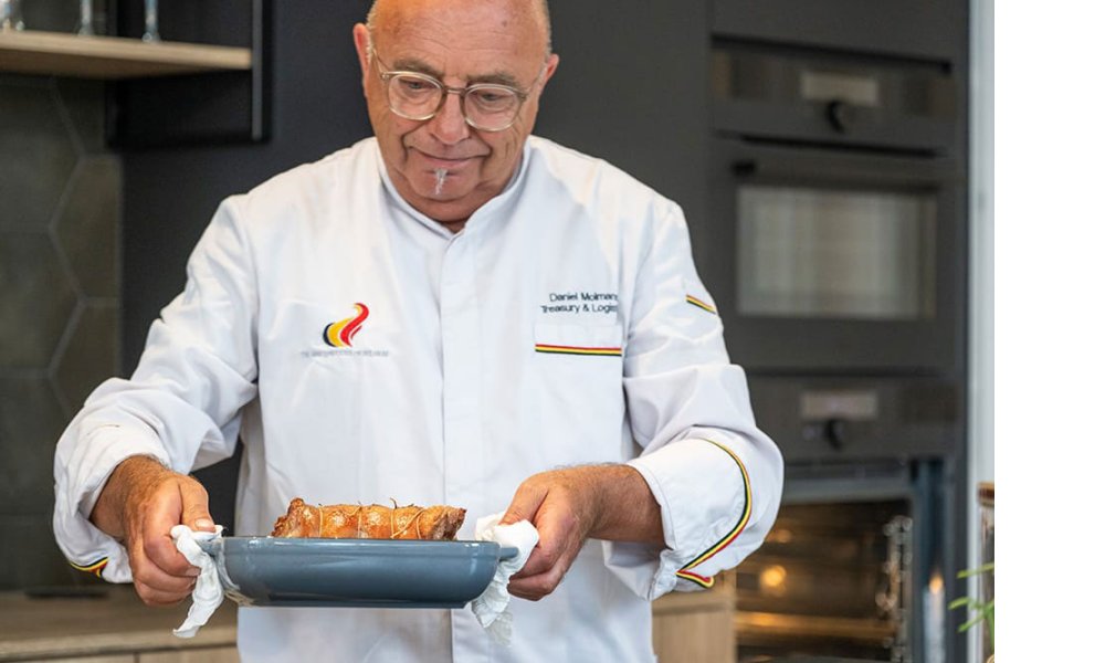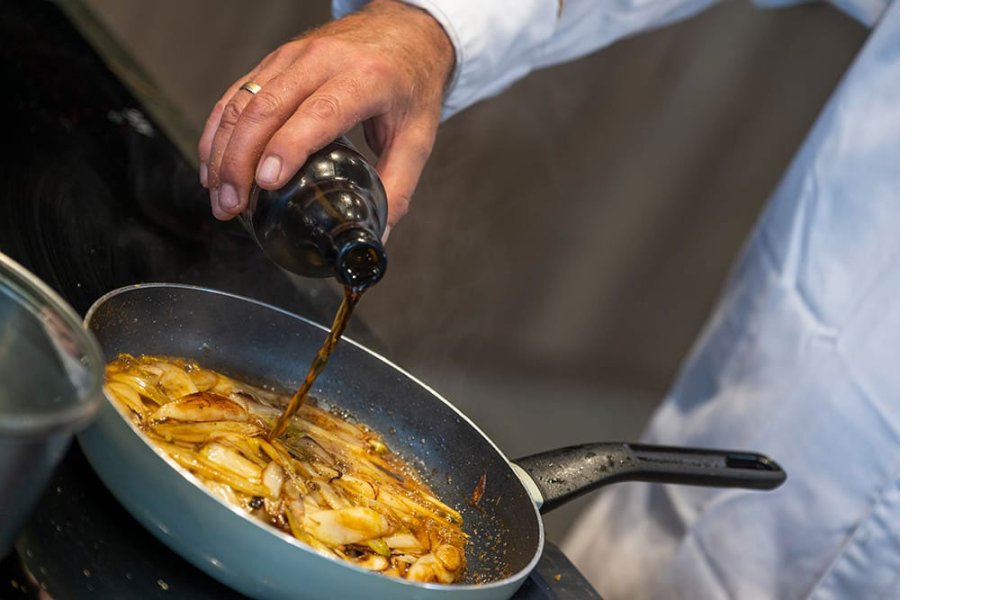 Gaar de witloof in een pan met boter en laat licht karamelliseren met bruine suiker. Deglaceer met Kasteel Donker en bewaar de jus voor de saus.