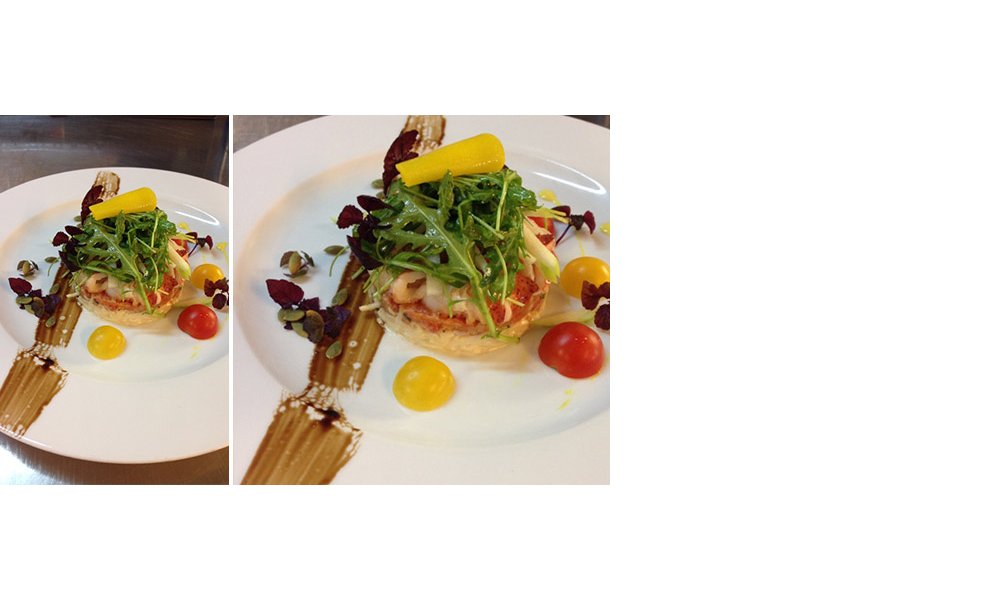 Leg een keukenring in het midden van het bord en verdeel daarin de knolselder, de gekonfijte tomaten, het kreeftenvlees en takjes bieslook.