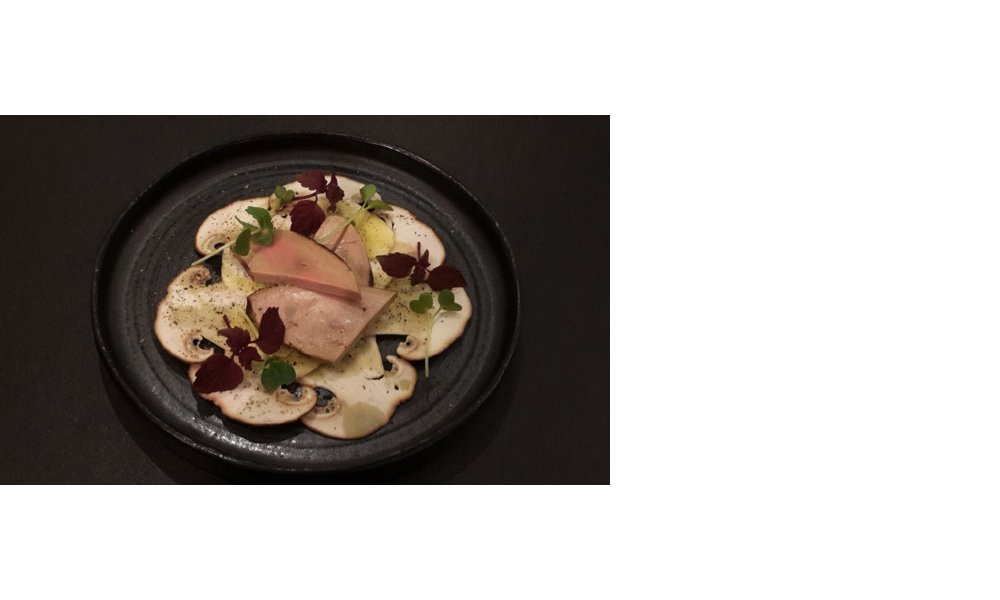 Leg er de plakjes ganzenlever op, kruid nog even met wat peper van d emolen en enkele druppels notenolie. Garneer met enkele shiso blaadjes.