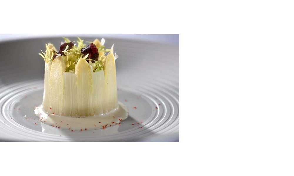 Schil asperges, kook ze en laat afkoelen. Snijd de bovenkant af en snijd in de lengte in dunne plakjes. Plaats deze rondom tegen de zijkant aan in een ring en duw goed aan.