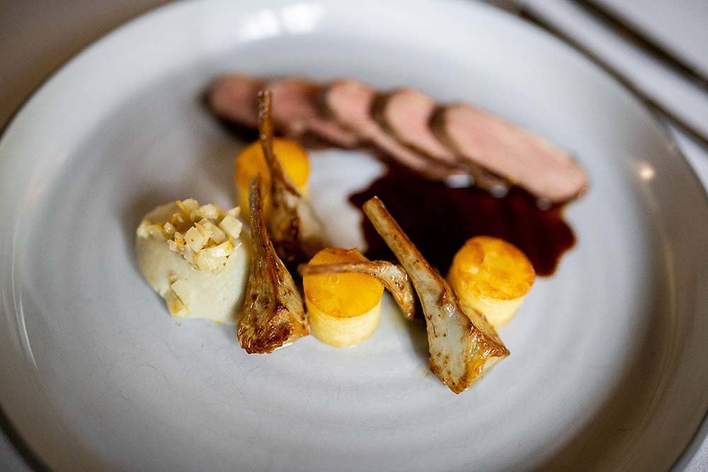 Natuurlijk praat Tristan ook over zijn keuken: ‘Zoals altijd, maak ik ook in Grandvoir enkel plaatselijk wild klaar. Momenteel is de ree die via de sluipjacht is geschoten afkomstig uit de Semois en gekocht in het slachthuis van Bertrix. Op het huidige Menu du Château maak ik hem klaar met een zwarte bessensaus en het eerste eekhoorntjesbrood.’