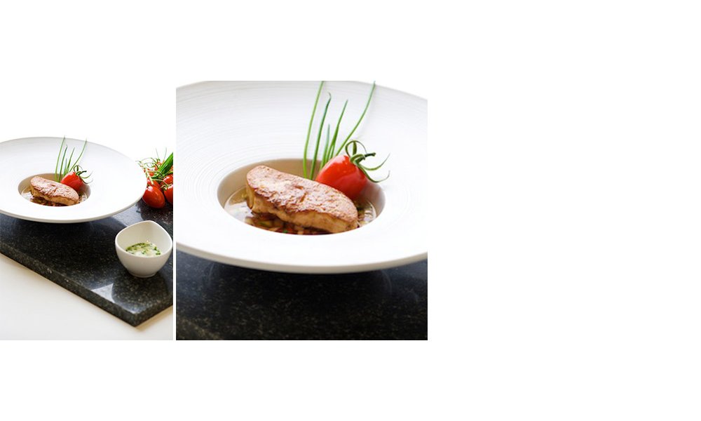 Leg in een diep bord de brunoise van groenten, daarop de gebakken ganzenlever en serveer de blanke botersaus met zoethout apart.