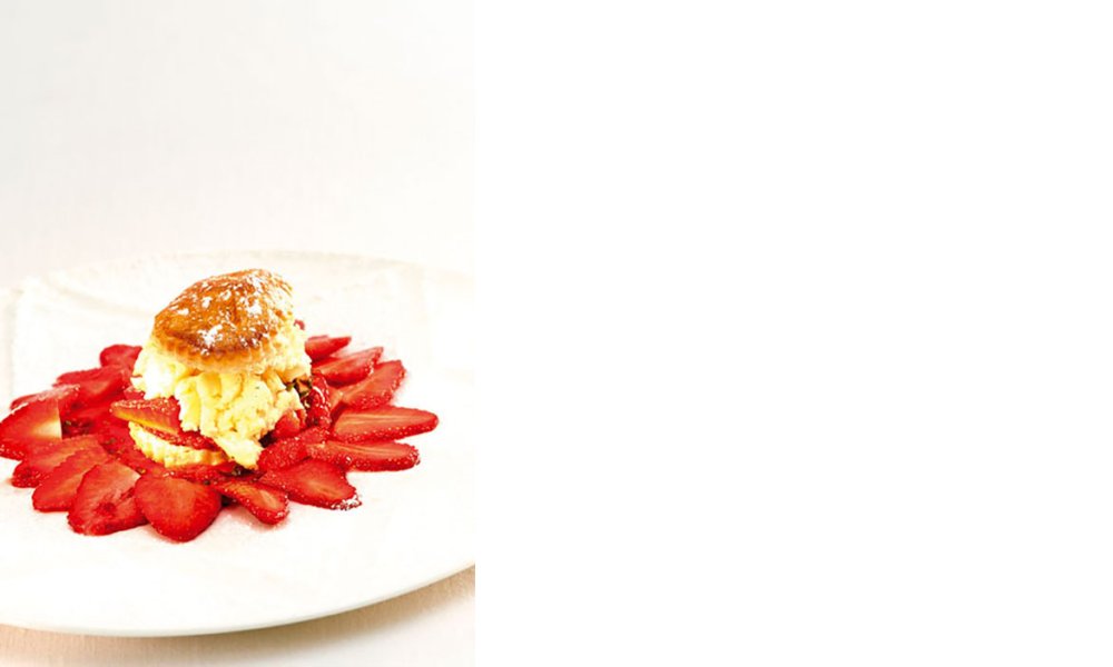 Open het bladerdeeg met de hulp van een mes, bedek met stukjes aardbeien en de vanillecrème. Serveer meteen.