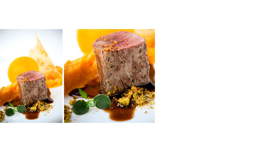 Snijd de filets en dresseer met de puree, saus en het loempiakrokantje, werk af met de pistachecrunch.