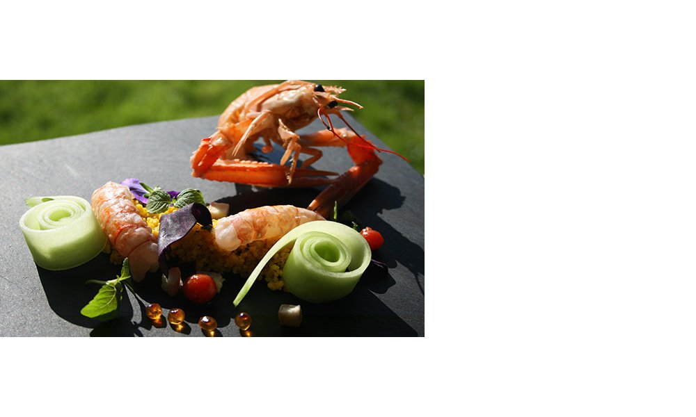 Pel de langoustines en verwijder het darmkanaal. Houd één gehele langoustine over voor decoratie. Bak in olijfolie en houd warm.