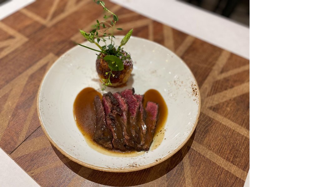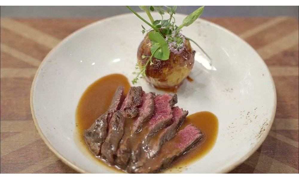 Neem een mooi bord en leg er bovenaan de ui Bonne Femme op, versier met enkele verse kruiden, leg onderaan de in schijfjes gesneden longhaas en werk af met de kalfsjus.