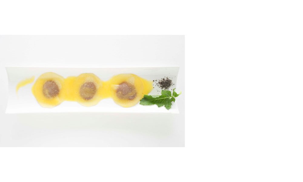 Koolrabi pellen en met behulp van een schaaf 12 zeer dunnen ronde plakken (raviolis) snijden. Aan het passiesap voegen we een stevige geut water toe en de suiker. Even laten opkoken terwijl er wordt geroerd. Nu één per één de koolrabischijfjes in deze warme jus gooien en even op een zacht vuurtje voor maximum 1 minuut laten sudderen. Van het vuur nemen, de raviolis eruit scheppen in ander recipiënt en wat passiecoulis erover verdelen. Zo in de koelkast bewaren en verder laten marineren. De overige jus/kooknat laten we even zacht inkoken tot een coulis. (opgepast niet laten verkleuren).