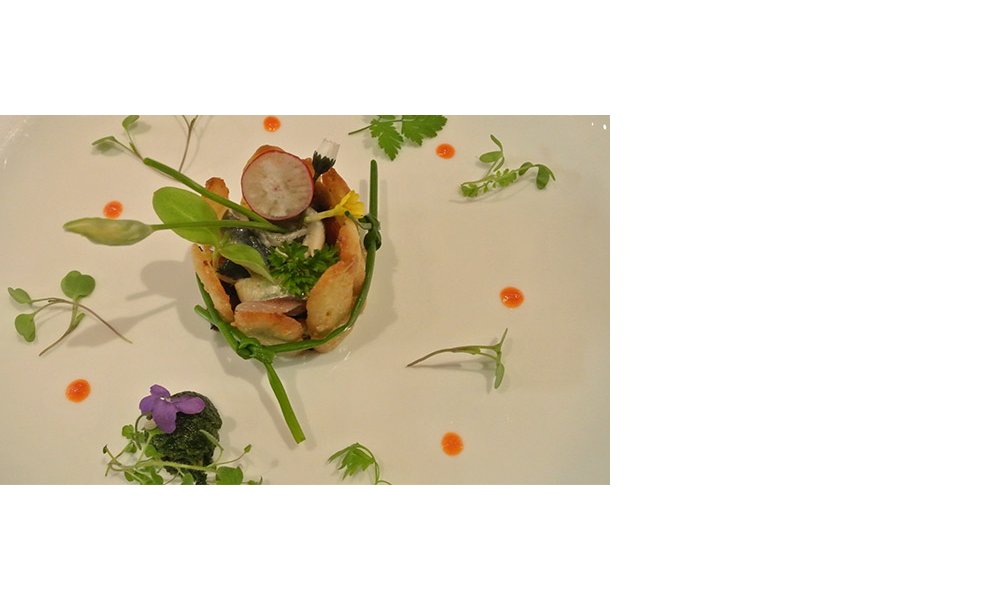 Afwerking : zet een keukenring op het bord en vul de wand aan met de biscuitreepjes. Vul het midden met de gegrilde groenten en leg er enkele opgerolde sardinefilets op. Verdeel er enkele kruiden en groenten over (bieslook, postelein, saladescheutjes..). Verwijder de keukenring. Lepel er de basilicumsaus bij. En werk het bord verder af met kruiden en groentescheutjes.