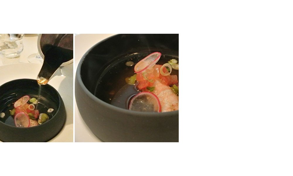 Leg de langoustinestaarten in een warm diep bord met een brunoise van tomaat, augurken, pijpajuin, zilveruitjes op azijn, geraspte citroenschilletjes, radijzen en gekonfijte gember.Giet de kokende bouillon over de langoustines tot ze voor de helft met de bouillon zijn bedekt.