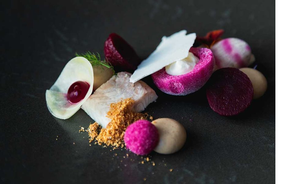 Sorbet van rode biet: Week de gelatine in koud water. Verwarm het suikerwater samen met de glucose. Los hier de gelatine in op. Meng de massa met het bietensap. Draai af in het ijsmachine.