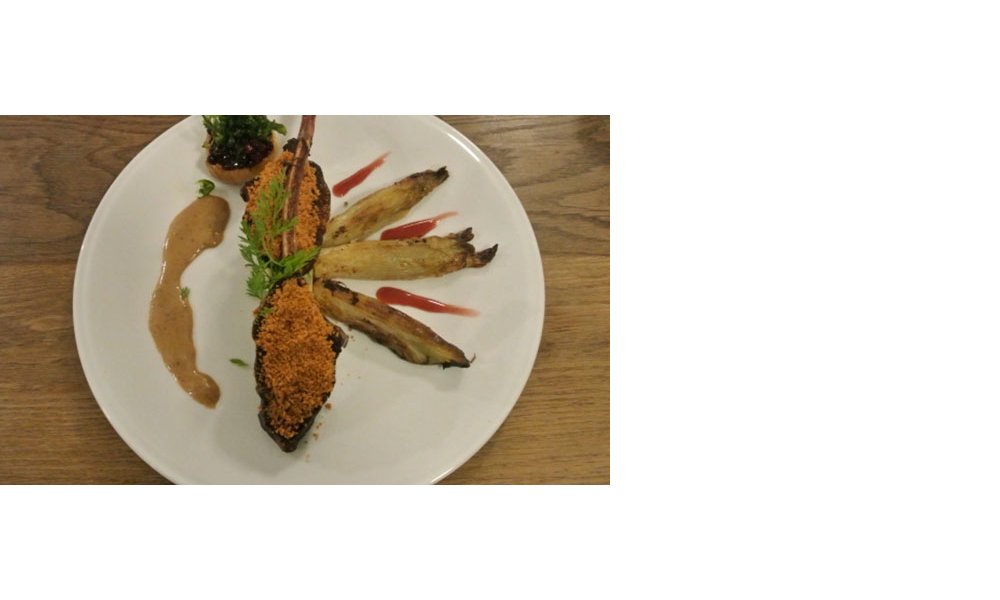 Verdeel de ingrediënten harmonieus, leg op elk bord een in drie gedeelde witloofstronk. Geef er een grand-veneursaus (jachtmeestersaus) bij en wat veenbessensap.