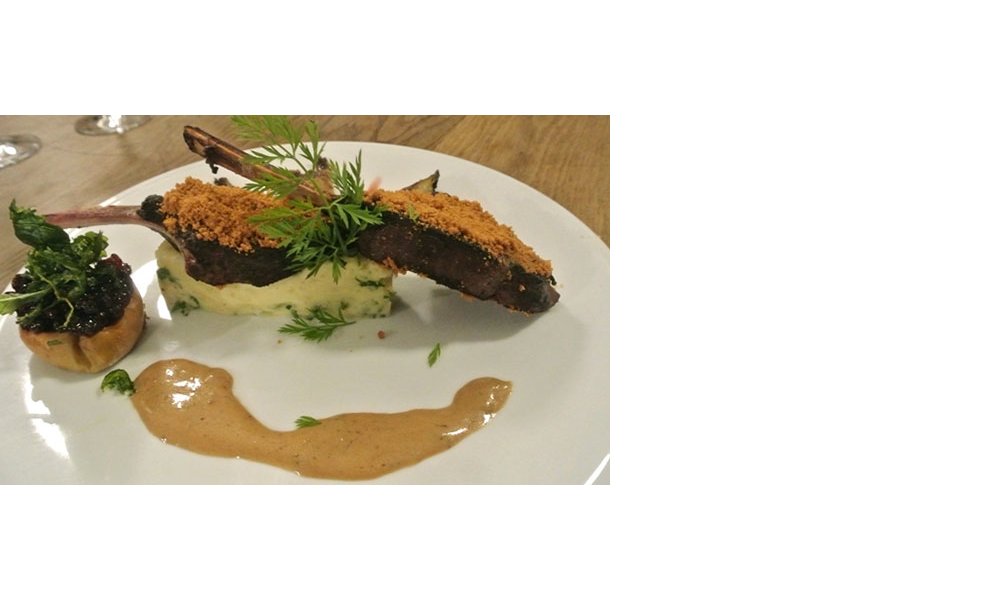 Bak de hertenribben eerst aan beide kanten aan. Leg er de gehakte speculaas op. Laat gedurende 5 minuten garen in de oven op 180°C.