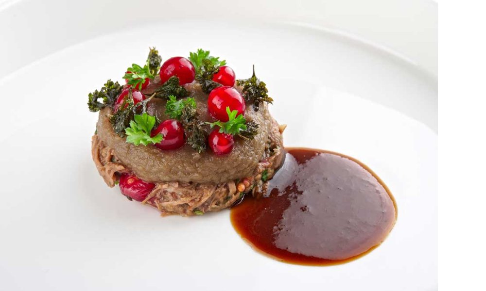 Verdeel het vlees over diepe borden. Bedek met de gerookte sjalotpuree. Bestrooi met fijngehakte peterselie en enkele rode bessen.