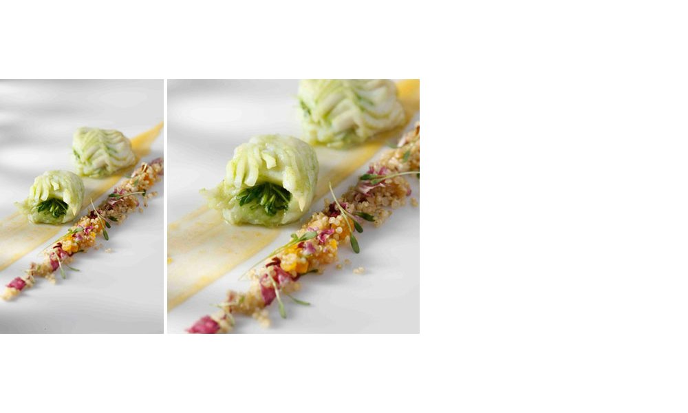 Plaats op elk bord een veeg légumaise. Plaats de vis op de veeg. Verdeel de quinoa salade over de borden en werk af met wat tuinkers.