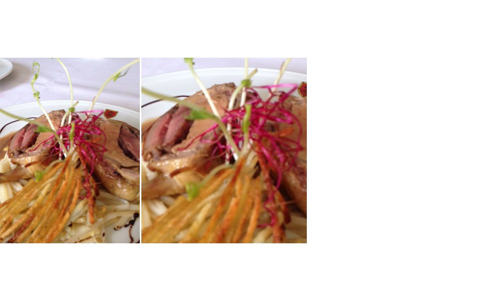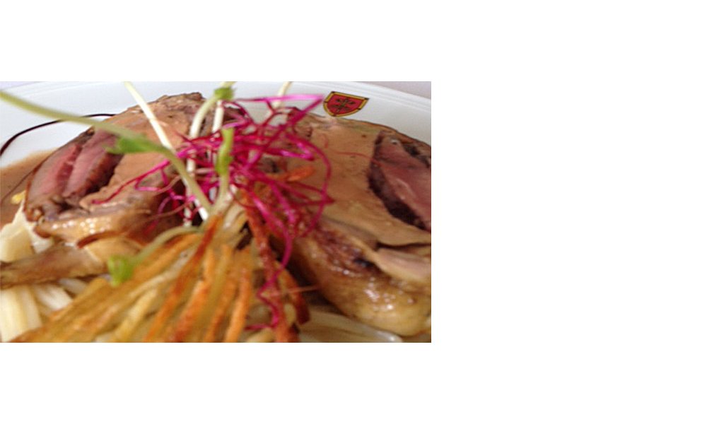 Serveer de hele duiven of snijd de duiven in twee, zoals op de foto, zodat je de duiven en de ganzenlever goed kunt zien. Garneer met de spaghetti van asperges, de scheuten van rode biet en erwten.
