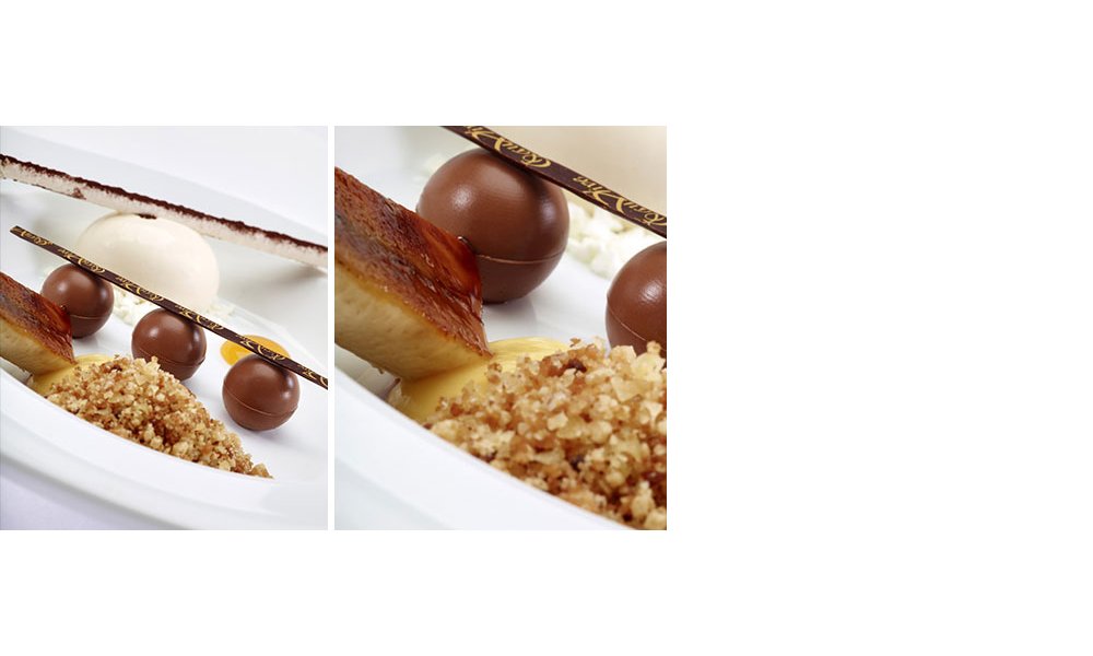 Maak een quenelle van de chocoladecrémeux en de passievruchtencrème op het bord. Leg een stuk gekarameliseerde banaan op de lopende chocoladeknikker.