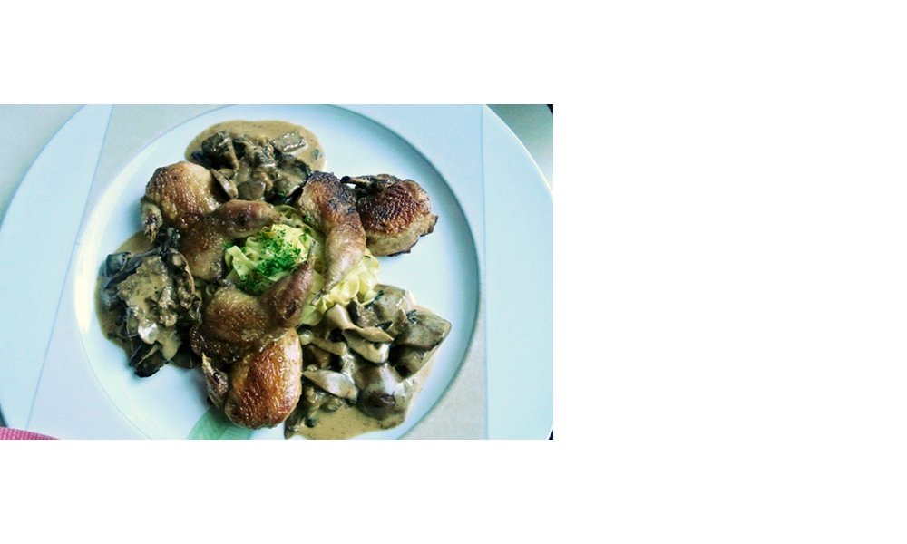 Garneer de borden : leg een deegnestje in het midden van elk bord, leg er de kwartels en de paddenstoelen rond.