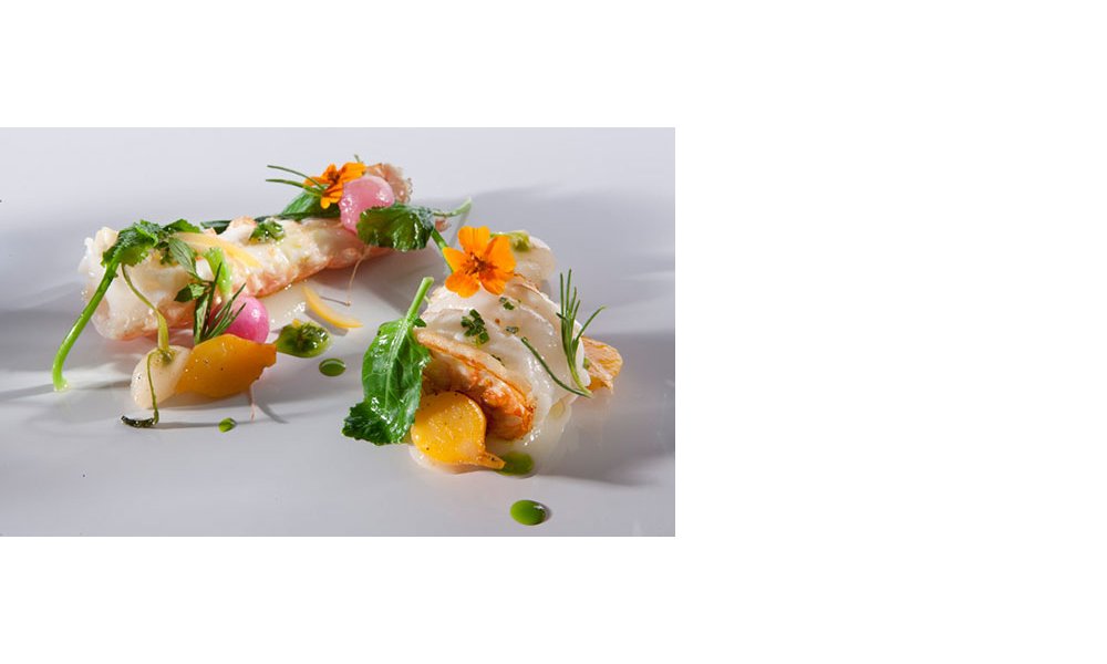 Werk de bakjus van de langoustines af met munt, gekonfijte citroen en muntolie.