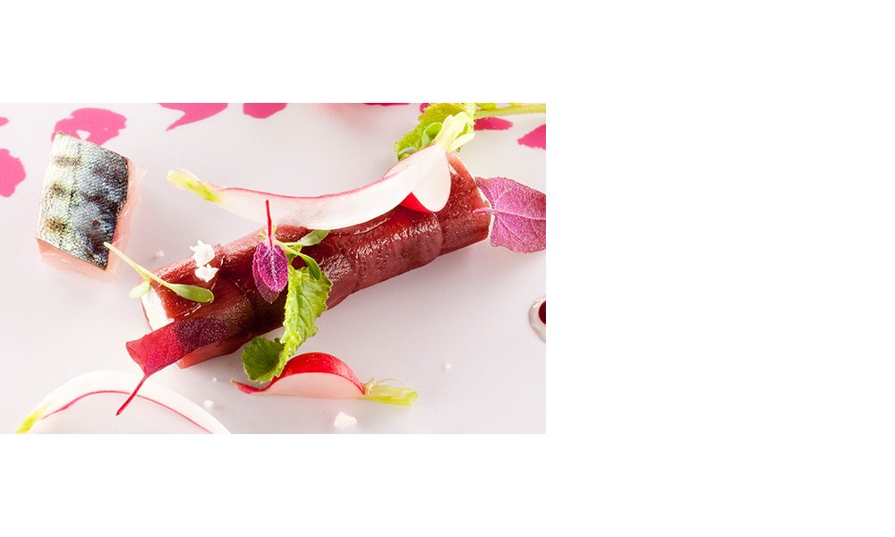 Een mondvol smaken en texturen zorgen hier samen voor een fris en frivool mondgevoel. Strak en vet tot een harmonieus geheel combineren is enkel mogelijk door juist te doseren. Het aangename vet van makreel temperen we door het vlees ‘a la minute’ kort te zouten. Het volvette van de verse kaas krijgt nuances door een rokerige toets en de zacht bittere smaak van radijs en ijskegel. Voor een aangename binding tussen vis en kaas gebruik ik vinaigrette van vlierbloesem die een florale en aardse toets aan het geheel toevoegt.