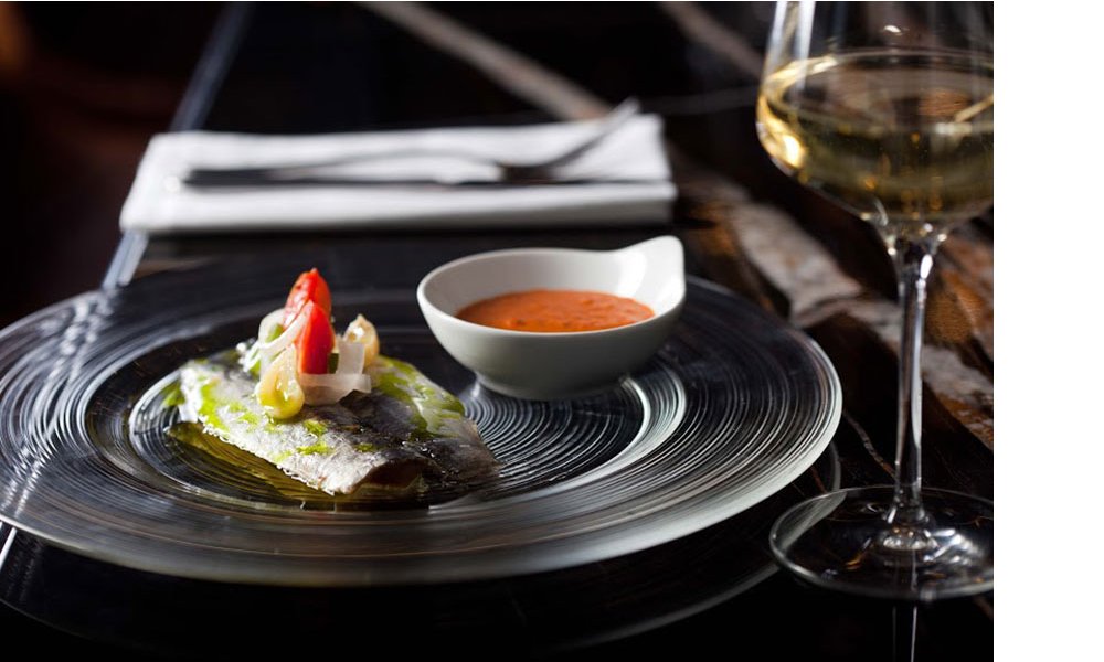 Leg de visfilets op een bord met de huidkant naar boven, leg er de uien op, de olie en de gestoofde kerstomaten. Serveer de harissa saus apart.