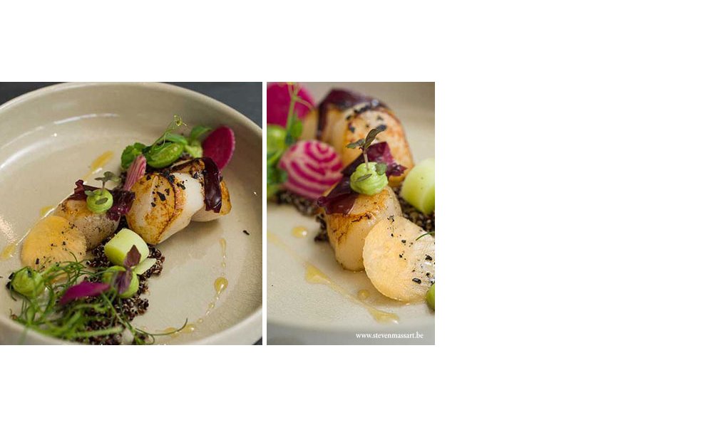 Leg de quinoa in een lange lijn uit met hierop de kort gebakken sint-jacobsvrucht.